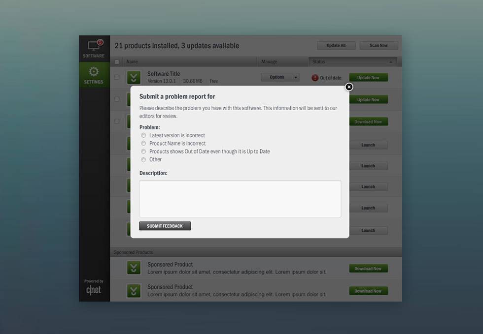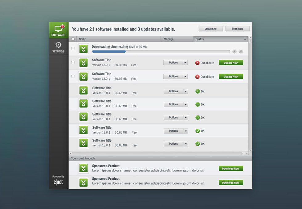 The Download App is a Windows application from Download.com that gives users the ability to scan, manage and install software updates. My goal is to create a simplified user experience while maintaining all functions and features of the application.